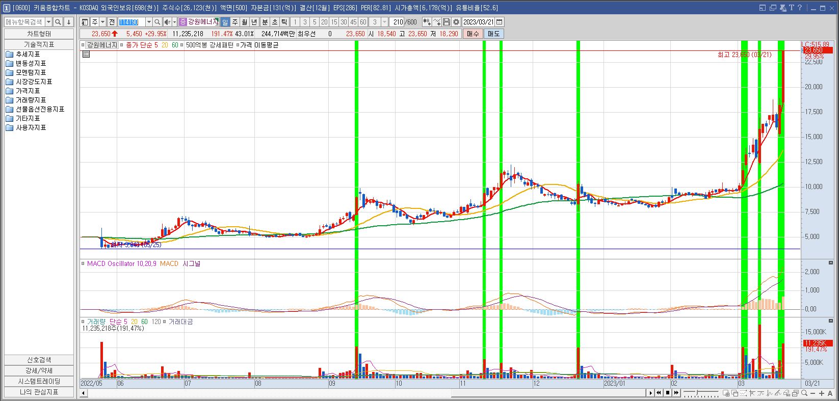 강원에너지는 리튬 테마에서 핫한 종목입니다. 바로 작년에 지분 취득으로 종속회사에 편입한 강원이솔루션 때문인 것으로 판단됩니다. 강원이솔루션의 무수수산화리튬이 삼성 SDI의 샘플테스트를 통과했다는 소식에 23.03.21 상한가로 마감했습니다.