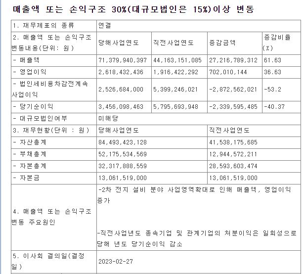 사업보고서는 아직 공시되지 않았습니다. 다만, 매출액 또는 손익구조 30% 이상 변동 공시에 근거하여 판단해 볼 수 있겠습니다. 매출액은 22년도에 전년 대비 61% 증가했지만, 당기순이익은 40% 감소하였습니다. 주요 원인으로는 직전 사업연도 종속기업 및 관계기업의 처분이익이 반영되었다고 합니다.