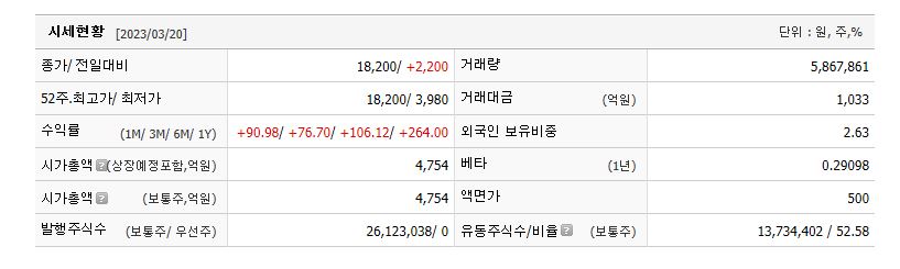 3월 20일 기준 강원에너지의 시가총액은 4,754억 원이며 발행주식수는 26,123,038주입니다. 이 중 유동주식수는 13,734,402주로 52.58%입니다.