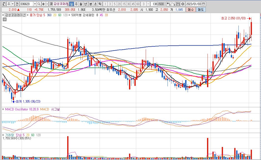 기술적 분석 상 장단기 이동평균선들이 교차하며 골든크로스를 만들고 있습니다. MACD도 0선을 돌파하며 상승신호를 보내주고 있습니다. 23년 첫 거래일인 1월 2일에는 대량거래를 동반한 장대양봉이 출현했습니다.