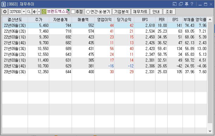 출처 : 키움증권 HTS 브랜드엑스코퍼레이션 재무추이