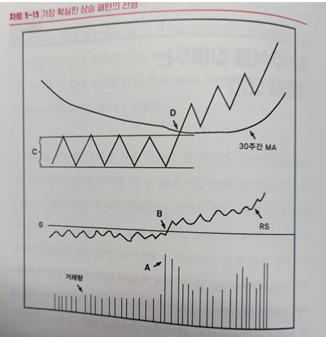 가장 확실한 상승 패턴의 전형을 친절하게 책에 그림으로 그려 놓아 주었습니다. 거래량이 동반되고 RS선이 0 선위에 위치하고 30주 이동평균선을 돌파하기 전 박스권 형성 등입니다.