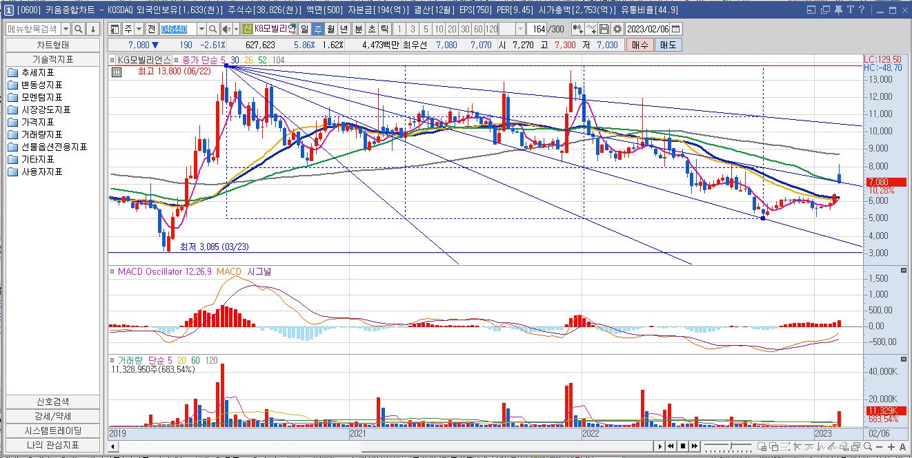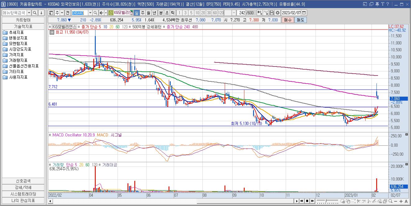 일봉상 2월 2일 시간 외 상한가로 마감 후 2월 3일 캡상승하여 6,480원대의 저항선을 돌파하고, 7,710원대의 저항선에서 저항을 받고 하락하는 모습입니다. 이 구간에서 힘을 비축 후 다시 상승할지 관심을 가지고 지켜봐야겠습니다.